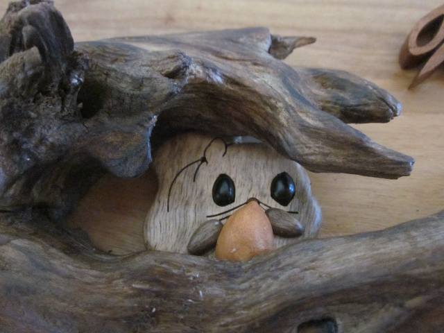サクラ材に流木のウロ部分を使い、中にモモンガを。