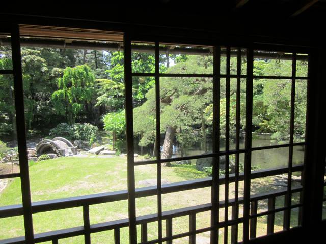 回り廊下のある格子ガラスを通し、新緑の庭を眺めながら
