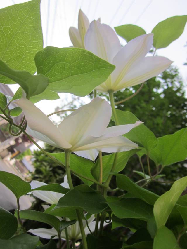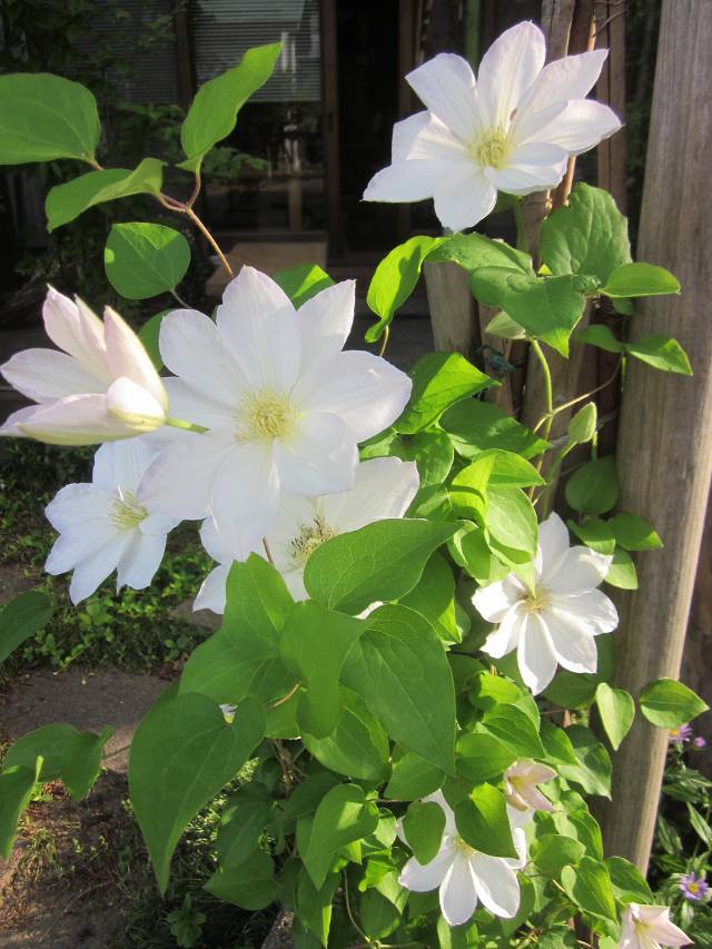 純白のクレマチス、白雪姫が朝陽に照らされています。