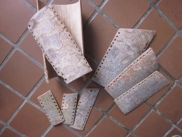 樹皮のパーツを、クルミの樹皮で編んでいます。